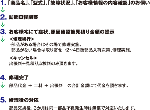 弊社では、大型家電を中心にお客様宅にお伺いしての出張修理を行っております。